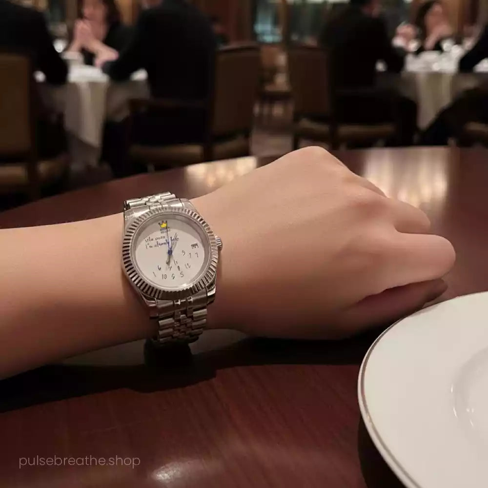 Don't let the humor fool you – this watch is crafted with a sleek stainless steel band and a distinctive bezel, ensuring you look effortlessly chic even when you're fashionably late.